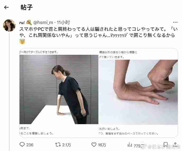 手机电脑玩多了,经常肩膀酸痛的人,请抱着被骗了也无所谓的心态来试试这个。你做的时候会寻思着「不是,这跟肩酸有什么关系嘛」,然后试过之后,肩酸真的消失了。1、把手指对着自己,手撑在桌子上。这时候,手臂到手肘,记得要保持是直的状态。2、用另一只手,将除了大拇指以外的手指,从小拇指开始一根根往上拉弹。3、做完一只手,换另一只手重复同样的动作。4、1天做个5组,不用太勉强,按照自己的节奏来。@玖天金狐